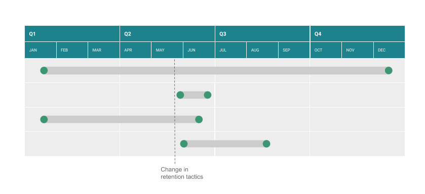 The specific period may vary from business to business, but looking at retention rates across different time periods may unlock your ability to track changes more responsively.